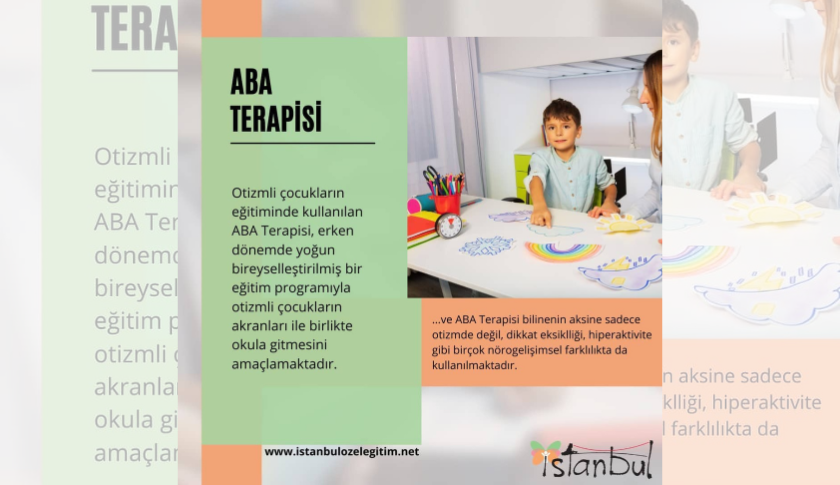 Otizmli çocukların eğitiminde kullanılan ABA terapisi, erken dönemde yoğun bireyselleştirilmiş eğitim programıyla otizmli çocukların akranları ile birlikte okula gitmesini amaçlamaktadır. Yapılan araştırmalara göre haftada 20-40 saat eğitim alan otizmli çocukların sosyal, akademik ve bilişsel açıdan akranlarını yakaladığını göstermektedir. ABA terapisi, otizmli çocuklarda istenmeyen davranışların azaltılmasını, alternatif davranışların artırılmasını hedefleyen ve davranışı çok iyi analiz eden bir yöntemdir.